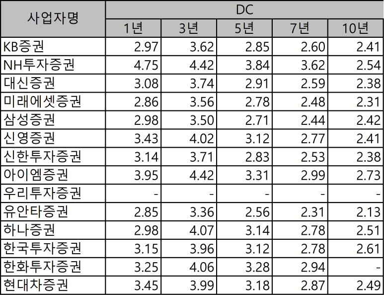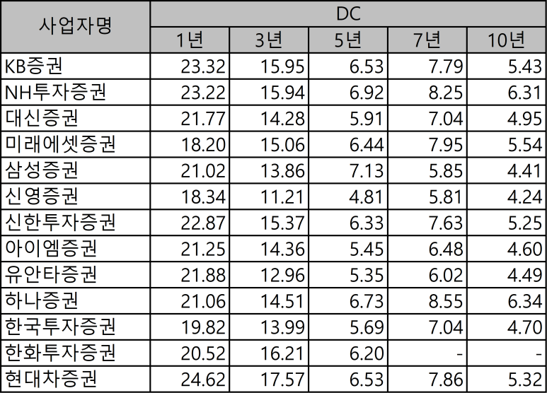 먼저 DC형 계좌에서 "원리금비보장 상품에 대한 투자 수익률입니다. 최근 1년 수익률이 모든 증권사에서 18%~24%대로 매우 높습니다. 이는 최근 주식 시장의 호황이 반영된 결과로 보입니다. 연금은 장기 운용 자산이므로 10년 수익률이 운용 역량을 판단하는 더 중요한 지표입니다. 장기 수익률은 대체로 4%~7%대에 수렴하고 있습니다.