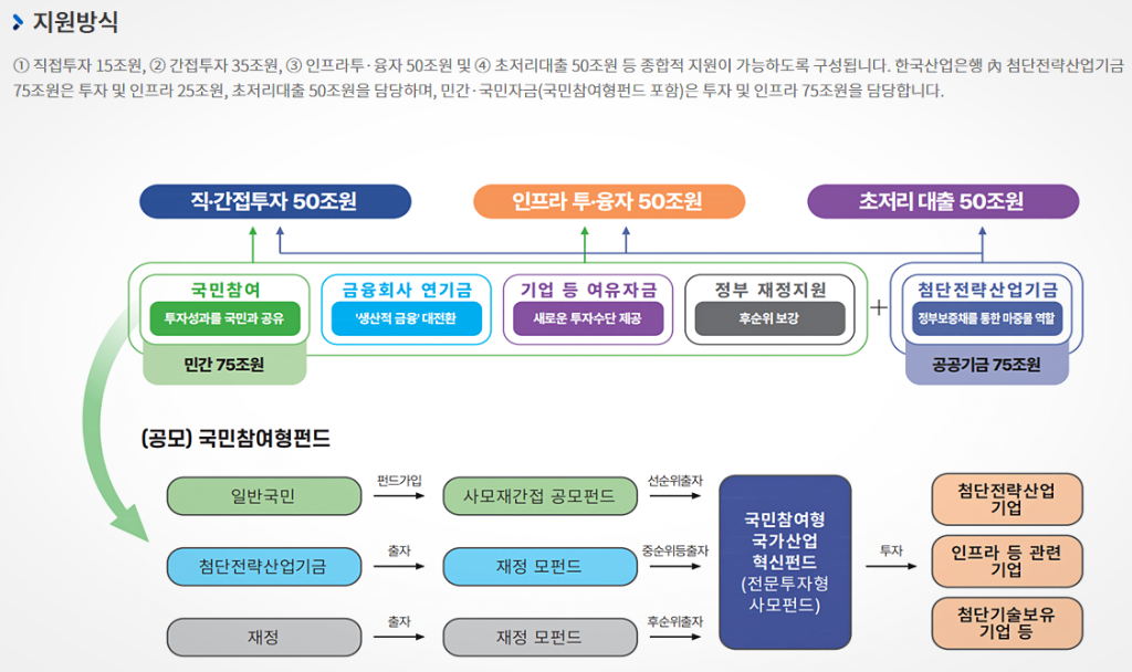 정부와 민간이 함께 5년간 총 150조원을 모아 AI, 반도체, 2차전지, 바이오 등 첨단 산업에 투자하는 대형 정책 펀드입니다. 이 중 개인이 직접 가입할 수 있는 게 국민참여형 국민성장펀드(공모펀드)인데요, 여기에 소득공제 + 배당소득 분리과세라는 혜택이 제공될 예정이며, 아래 이미지와 같은 방식으로 운영될 예정입니다.