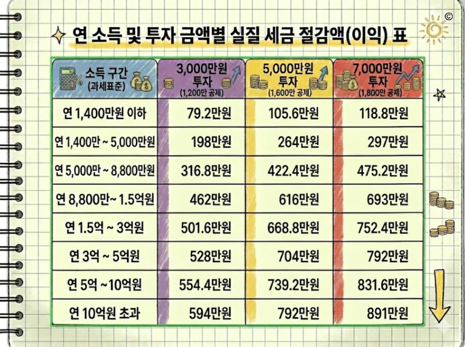 소득구간(과표기준) 및 연간 투자금에 따라 얻을 수 있는 예상 세금 절감액은 다음과 같습니다.