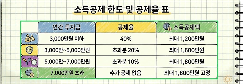 국민성장 펀드의 혜택 중 가장 큰 혜택이라 할 수 있는 것은 소득공제 혜택입니다. 아래와 같이 투자금에 따라 소득공제를 받을 수 있습니다. 참고로 "소득공제"는 개인연금/IRP 를 통해 받을 수 있는 "세액공제"와는 달리, 소득이 높은 분들의 경우 유리한 항목입니다.